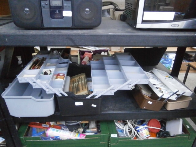 This is a light gray, tiered, and expandable plastic art supply organizer with multiple compartments and metal hinges and clasps.