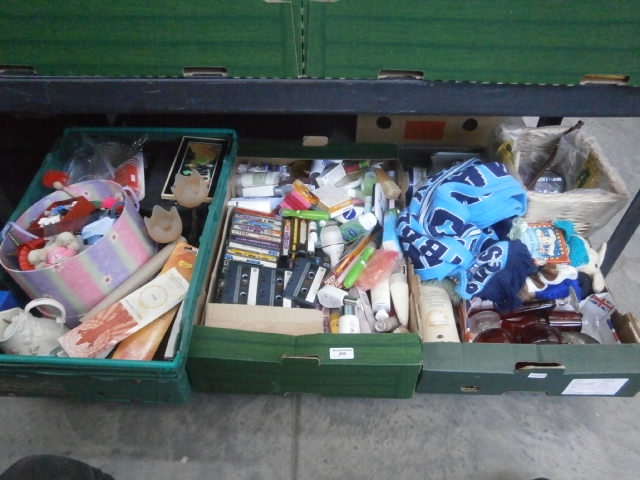This lot contains a variety of household items, including toiletries, media, toys, and decorative objects, housed within three green plastic crates.
