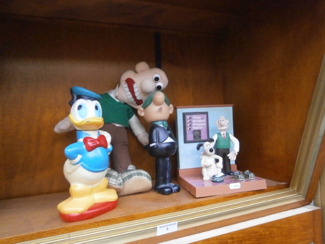 This lot features a Donald Duck figure, a plush toy, and a diorama with two figures and a dog.