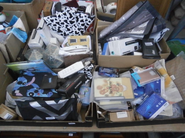 Two boxes containing various accessories including fabric items, cases, phone cases, and masks.