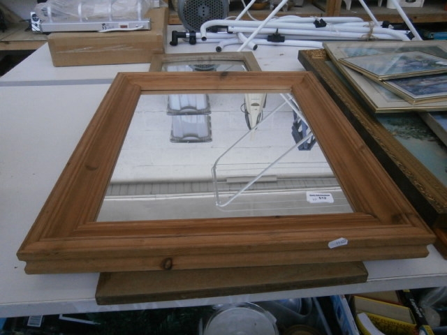 A rectangular mirror with a natural wood frame featuring a layered profile.