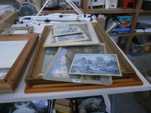 This lot features multiple framed pictures, including landscapes, seascapes, and village scenes, housed in natural wood and ornate gold-colored frames.