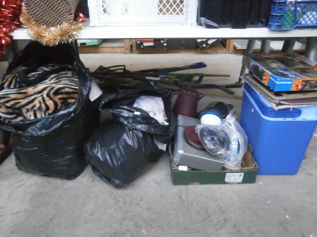 This lot contains two trash bags with a blanket and various items, a green box with electronics, a blue cooler with stacked items including a Hamburger King box, and long-handled tools.