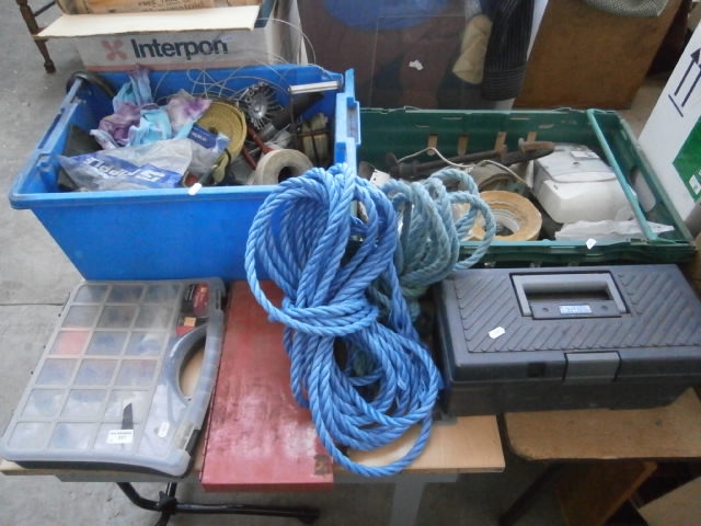 This lot contains a large coil of blue rope, various tools, a blue tote bin, a grey toolbox, a clear organizer case, a green crate, and a red board.