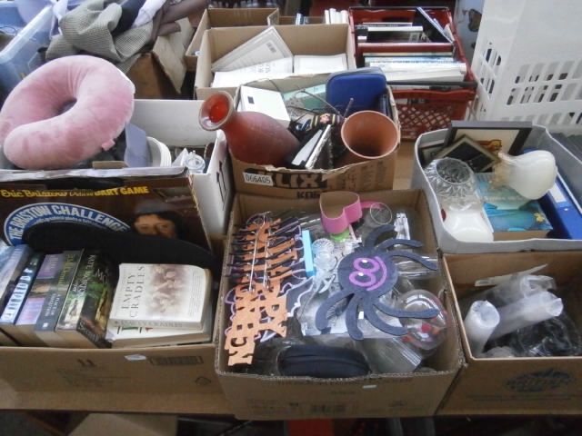 This lot includes a pink neck pillow, a red glass vase, several books, Halloween decorations, and a clear glass object.