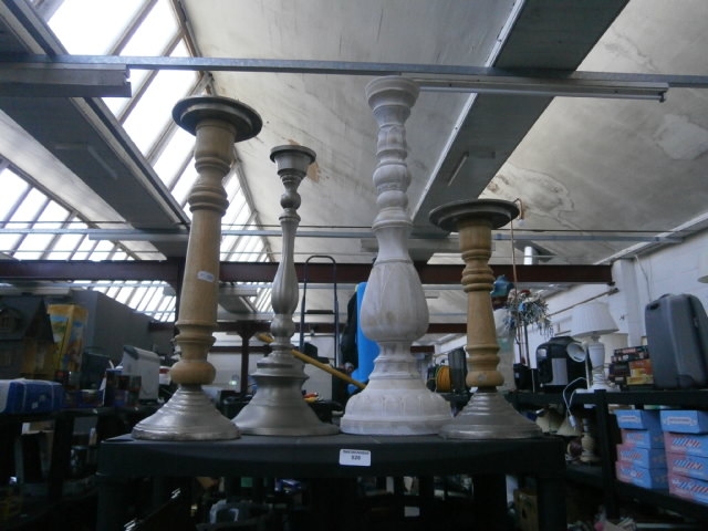 This lot features four candlesticks in various styles and materials, including metal and distressed finishes.
