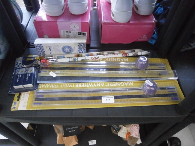 This lot features two magnetic twist trimmers with rulers, two patterned pencils, and a package of three erasers.