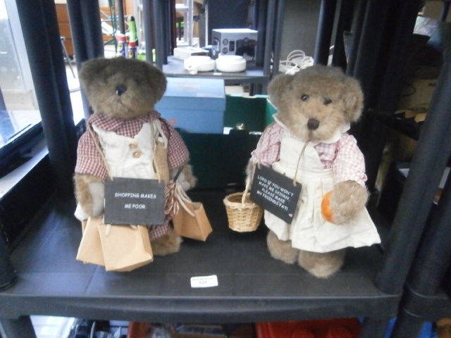 Two brown plush teddy bears, each wearing checkered shirts and pinafores, holding humorous signs and accessories.
