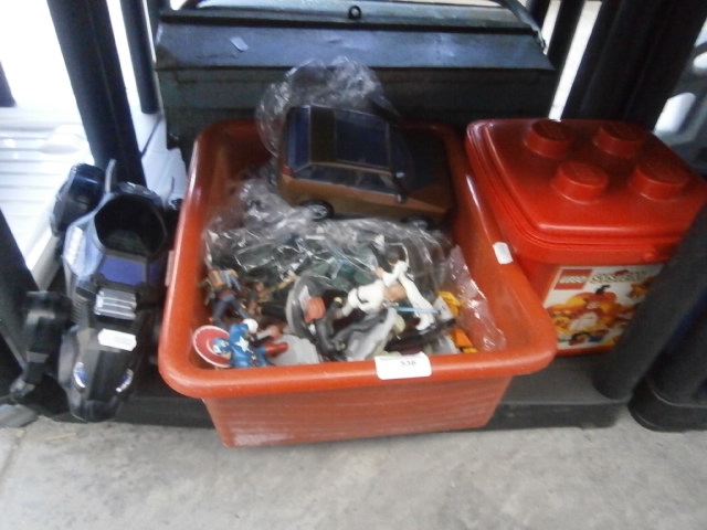 A collection of plastic action figures, a toy car, and a LEGO storage container.