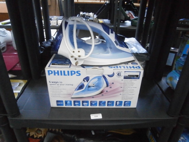 A white and blue Philips steam iron with a silver soleplate, presented in its original packaging box.
