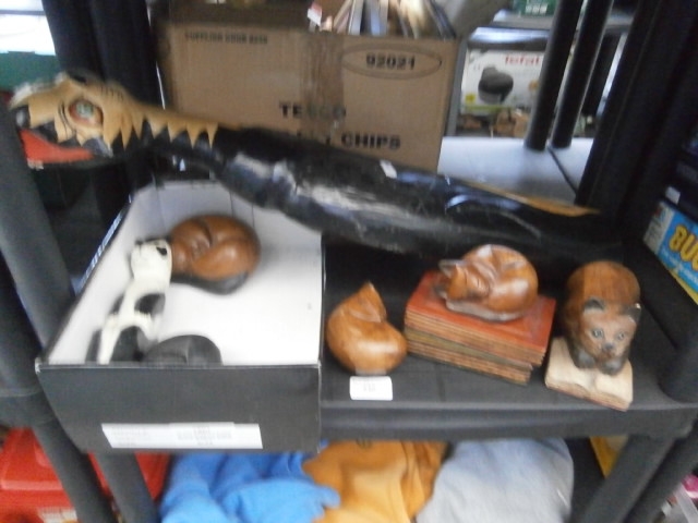 A collection of carved wooden animals including a snake, dog, cat, and hedgehog, along with other decorative objects.