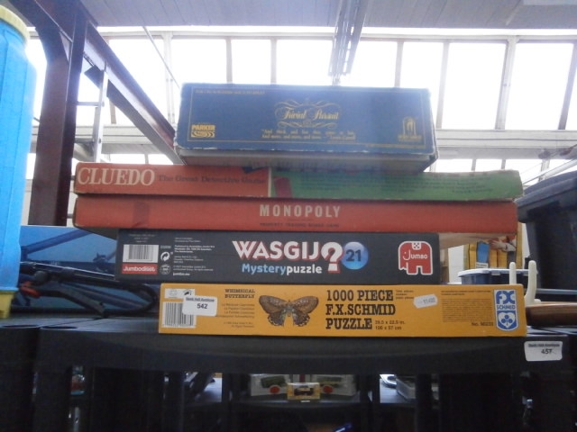 A stack of four games including Trivial Pursuit, Cluedo, Monopoly, and a Whimsical Butterfly puzzle.