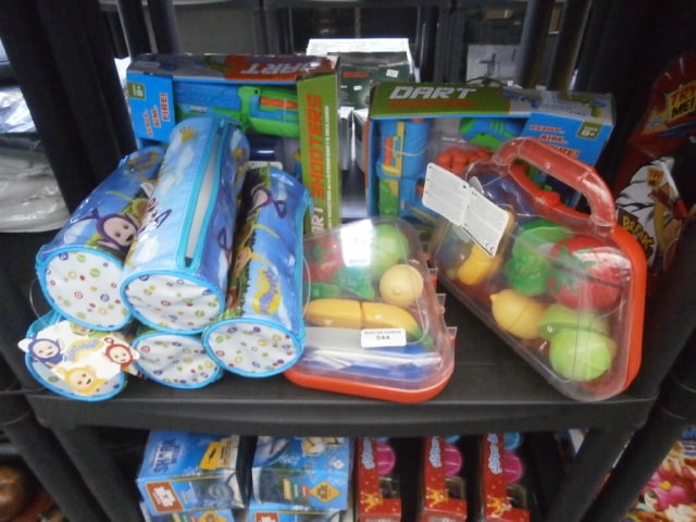 This lot features toy dart guns in boxes, along with multiple pencil cases and a container of toy fruits and vegetables.