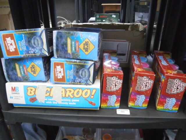 This lot features several boxed games including “Shark Week” and “Buc-a-roo!”, along with “fun dough glitter dough” craft kits.