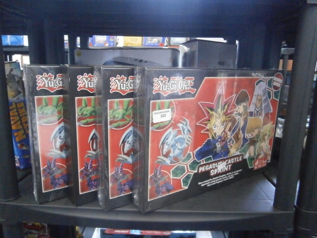 Four sealed Yu-Gi-Oh! product boxes featuring characters and monsters from the trading card game.