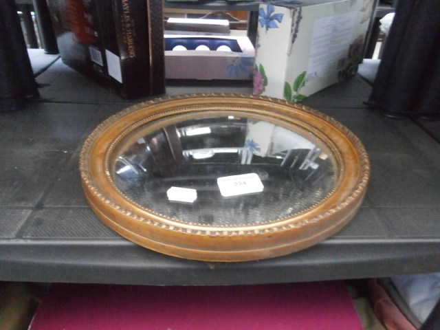 An oval mirror with a textured, golden-brown wooden frame featuring a beaded pattern.
