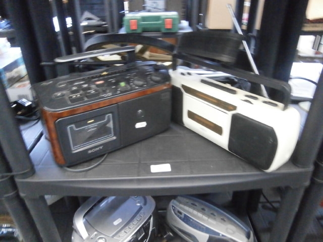 This lot features two portable boomboxes, one black Sony model with wood-grain trim and one white model.