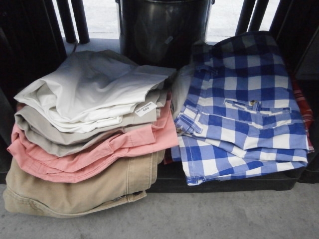 This lot features a stack of folded clothing including solid colored garments and items with a blue and white gingham pattern.