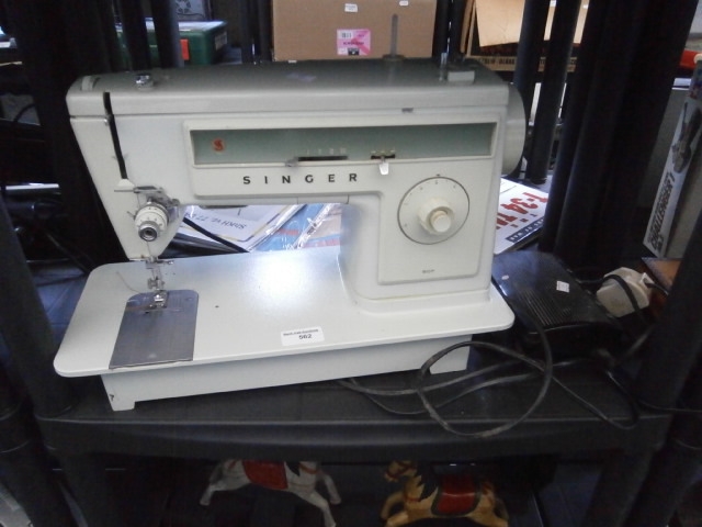A white Singer sewing machine with a black foot pedal and power cord.