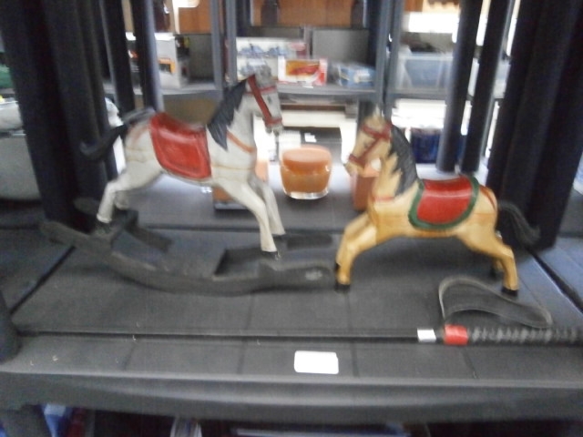 This lot features two decorative rocking horses, one white and one tan, each with a red saddle and bridle, along with a possible whip.