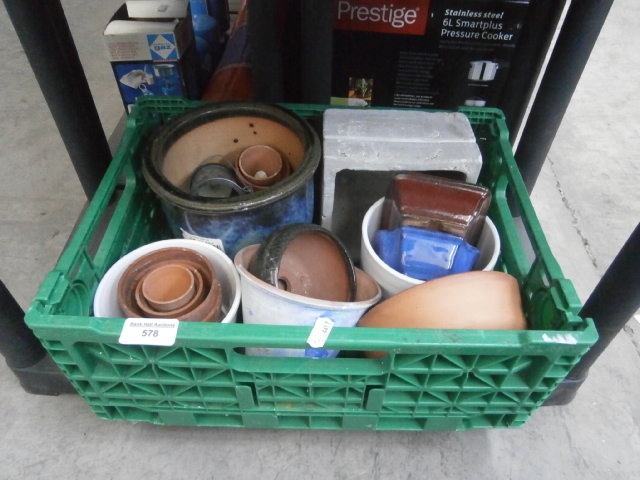 A green plastic crate containing multiple terracotta pots, a speckled glazed pot, a white pot, a plastic container with reddish-brown substance, a blue plastic item, and a concrete block.