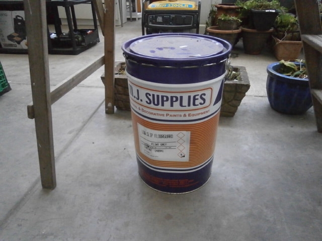 White cylindrical metal container with orange bands, dark blue lid and base, featuring “D.J. SUPPLIES” and “NON SLIP FLOORGUARD” branding.