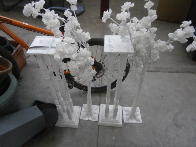 This lot features two white decorative stands with artificial white roses on branches.