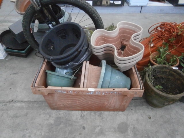 This lot features a collection of various planters in different shapes, sizes, and colors, along with a bicycle wheel and an orange cord.