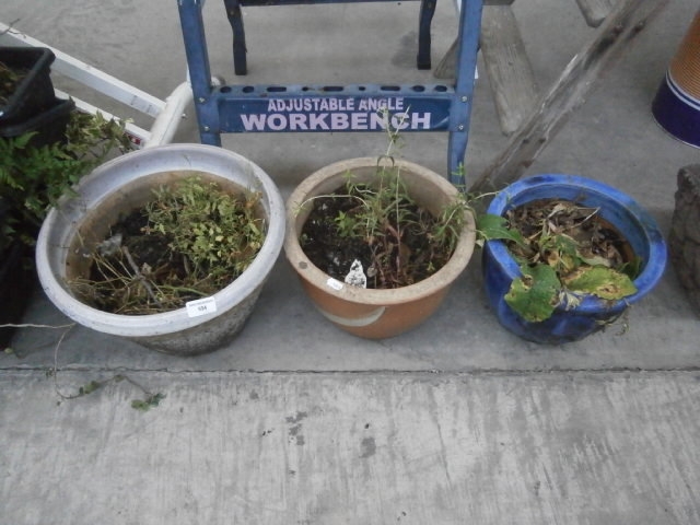 This lot features three round planters in varying colors and materials, all containing soil and plant debris.