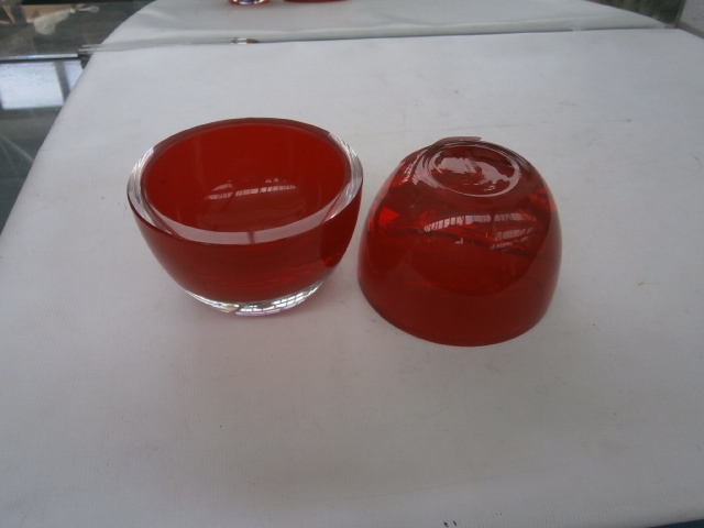 This listing features two translucent red glass items, one a shallow bowl and the other a domed object.