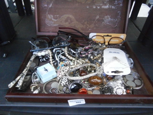A wooden box containing multiple necklaces, eyeglasses, rings, earrings, bracelets, and coins.