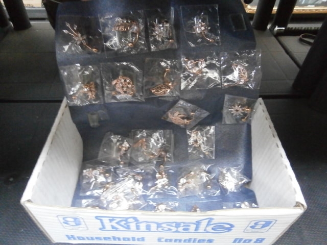 A collection of rose gold tone metal charms with intricate designs, presented in a decorative box.