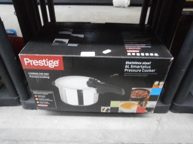 This is a new Prestige Smartplus 6L stainless steel pressure cooker presented in its original packaging.