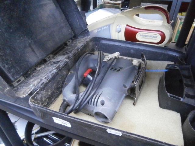 A black plastic carrying case containing a jigsaw and a handheld vacuum cleaner.