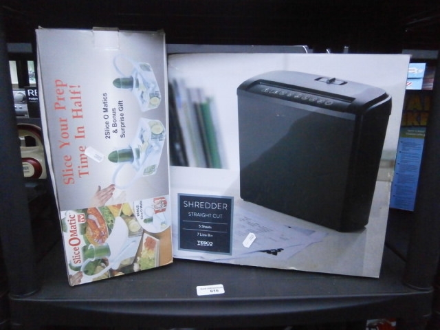 Two kitchen gadget boxes, one for a “Slice O Matic” and the other for a “Tesco” paper shredder.