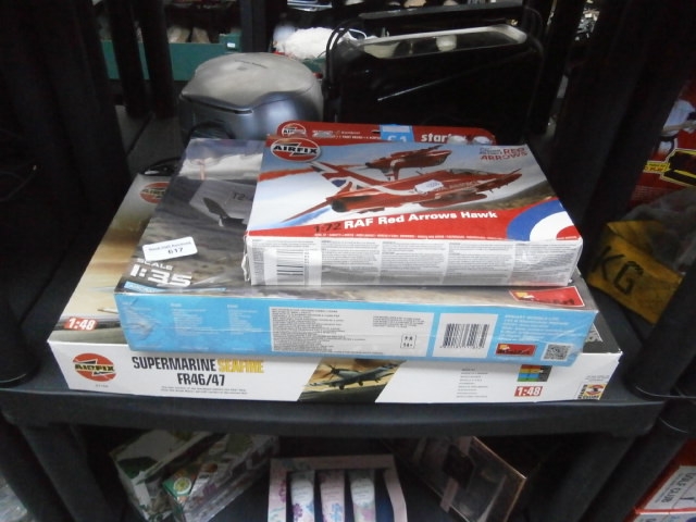 Three boxed Airfix model aeroplane kits including a Red Arrows Hawk and a Supermarine Spitfire.
