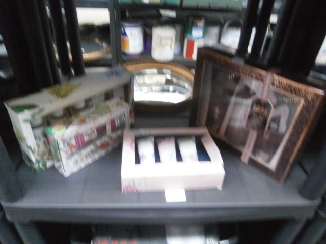 Three gift sets, two in floral boxes and one framed, presented on a shelf.