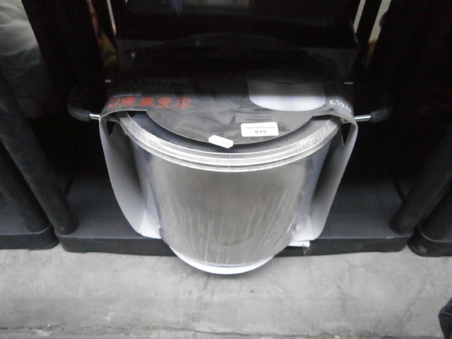 This is a stainless steel stockpot with a lid, presented in its original packaging.