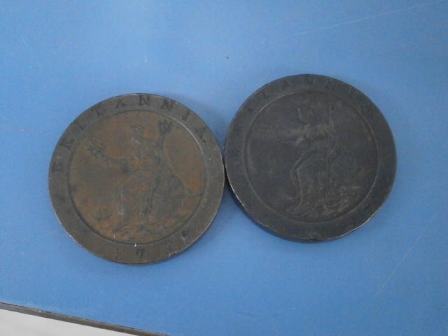 Two metal coins featuring the Britannia motif.