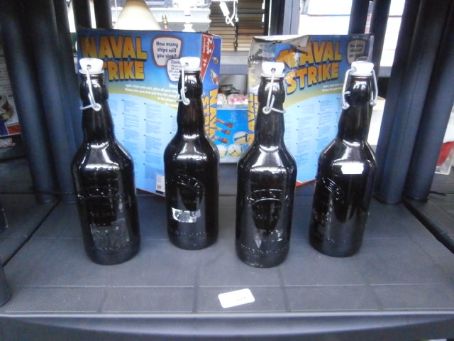 Four dark brown glass bottles with white ceramic swing-top closures and embossed detailing.