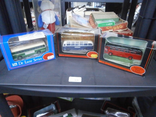 This lot features three boxed model buses, each appearing to be 1:76 scale, with one box indicating “De Luxe Series” and another “Exclusive First Editions”.