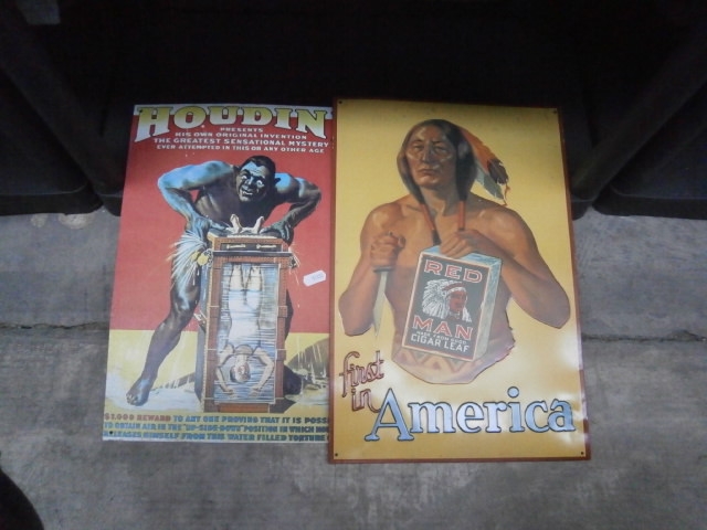 Two rectangular metal advertising signs, one for Houdini’s mystery act and the other for Red Man cigars.