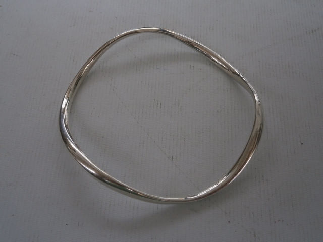 This is a silver-toned metal twisted bangle bracelet.