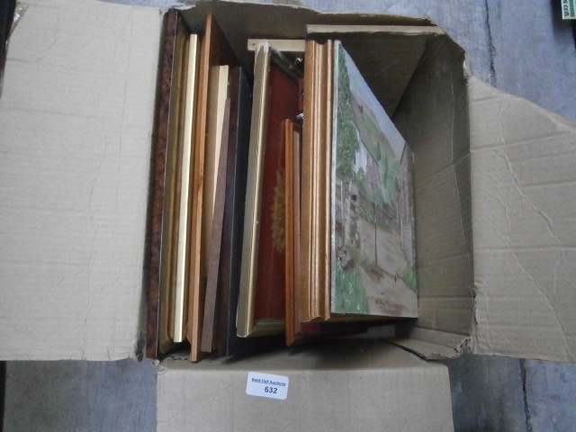 This lot contains multiple framed pictures with varied frames, including landscape and patterned artwork, stored in a cardboard box.