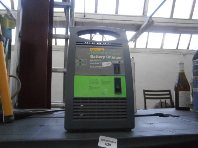 A dark grey, rectangular battery charger with a green front panel and indicator lights.