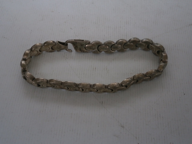 This is a metal bracelet with an oval link chain design and a hook and loop clasp.