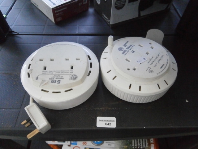 Two white, circular, retractable extension cord reels with multiple socket outlets.