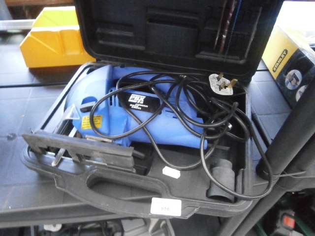 A blue Stanley EBX jigsaw with a black cord and plug, stored in a black plastic carrying case with saw blades.