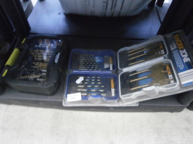 This lot features three sets of drill bits, including one set in a black and yellow case branded “Xtreme” and two sets in blister packs branded “WORK ZONE”.