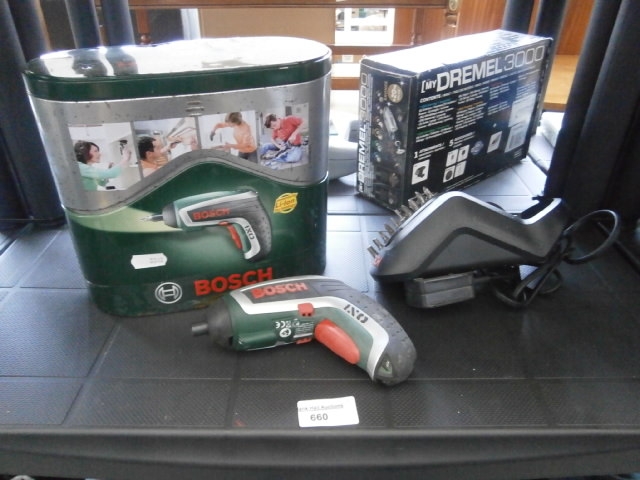 This lot includes a Bosch IXO cordless screwdriver, a Dremel 3000 tool with accessories, and a Bosch branded tin.